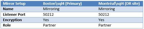 After the system goes down, it is undesirable to have the active system push data to the passive system (it cannot anyways). So it is important to break the mirror with the primary data center server and then re-establish it after the primary data center (in this example, Boston) server is back online. Note that the disaster recovery (in this example, Montréal) server is the one that is now active, so you will need to manually transfer the data from the DR site server back to the primary data center server (in this example, Montréal to Boston). To fully break the mirror, execute the following on the primary server: